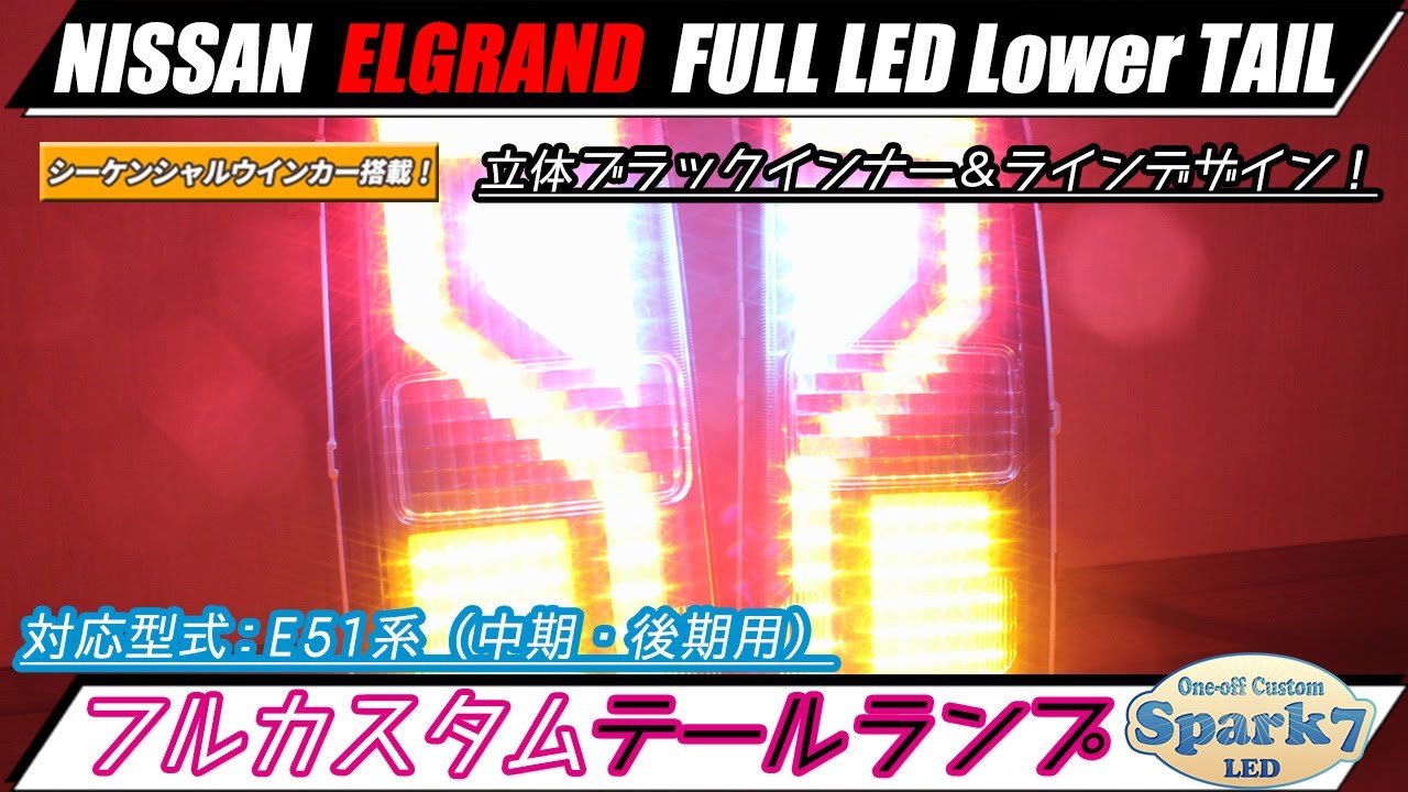日産 エルグランドのシーケンシャルウインカー内蔵タイプ、立体ブラックインナー仕様の純正クリアロアテール加工のフルLEDロアテールです。