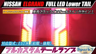 日産 エルグランドのシーケンシャルウインカー内蔵タイプ、立体ブラックインナー仕様の純正クリアロアテール加工のフルLEDロアテールです。